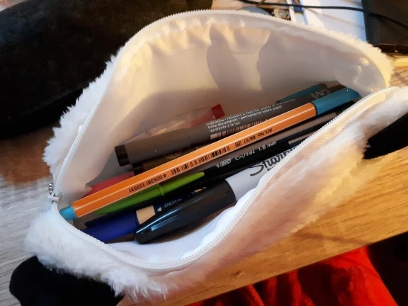 The pencil case is really soft, it's big and it has space for sharpies, and even highlighters. The store shipped it really fast and I'm super satisfied about my pencil case.